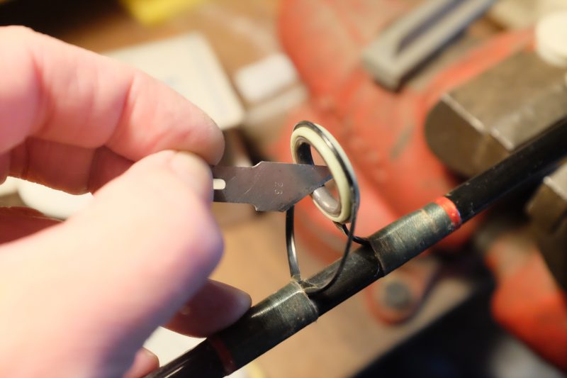 Tenzij voor wie alles graag met plakband doet, is wikkelen de beste én mooiste manier om een hengeloog te monteren.Een noodzaak bij het afbouwen van een blank, restauratie van een hengel of vervanging van een kapot oog. Vooral dat laatste maak ik steeds vaker mee. Er is een tendens om geleideogen lichter en dunner te maken, met als gevolg dat de keramische binnenring nu kwetsbaarder is dan bij de traditionele modellen. Ook is het keramisch materiaal van veel goedkope (Chinese?) ringen echt ondermaats. Een goede tik kan genoeg zijn om zo’n ring om zeep te helpen. Onlangs een oog vervangen op een uptide-hengel. Slechts enkele malen mee gevist maar reeds een stukje uit de keramiek. Die blijkt zo bros dat ik zonder moeite de ring met mijn vingernagel verder kan afbrokkelen…Vervangen is dan altijd de boodschap, want zelfs het dunste barstje zal de lijn beschadigen.