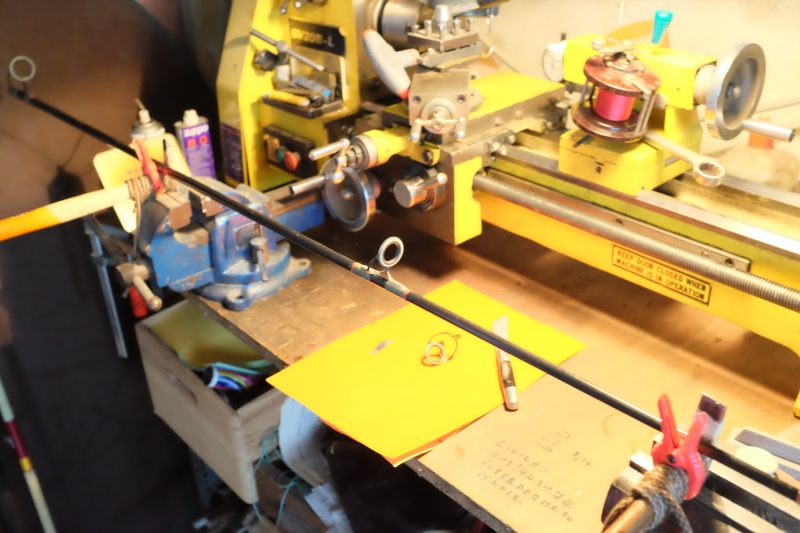 De hengel die ik hier opnieuw ga wikkelen is een Engelse beach-caster uit de jaren 80. Heeft héél veel meegemaakt, maar de originele Fuji-ogen zijn nog als nieuw en zonder de minste beschadiging. Het zijn de modellen met kunststof schokring en deze zijn toch wel heel goed.