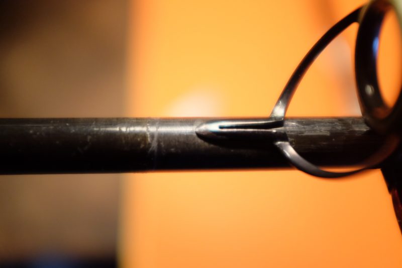 Met het blote oog onzichtbaar: een haarscheurtje in een nieuw oog bedoeld voor een big game hengel. Bij het monteren van het oog zet ik de voetjes goed vlak en hoor ik “klik”. Niks fout te zien maar toch even checken met een Stanley-mesje, en ja hoor: goed voor de vuilbak. Een ander oog uit dezelfde set deed net hetzelfde en heb heel het zootje dan maar weggesmeten. Deze ogen, en ik had voor alle zekerheid de wat duurdere genomen, worden op het web aangeprezen als zijnde onverwoestbaar, stel je voor… Moraal: koop geen ogen van een onbekend merk via het internet.
