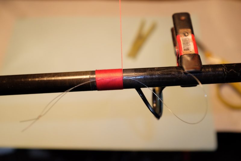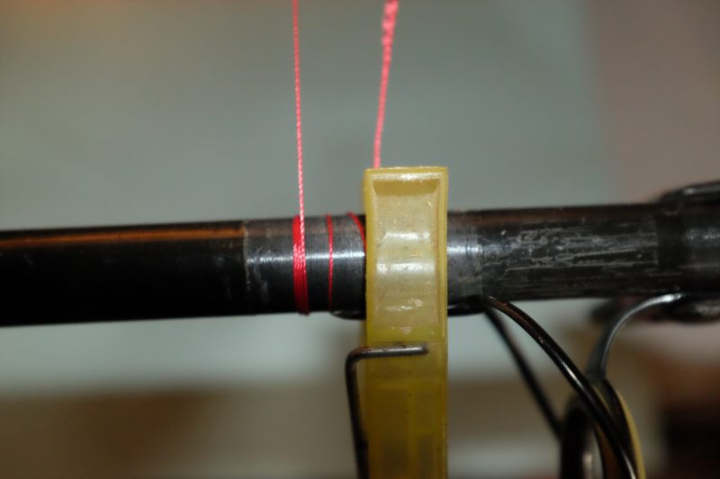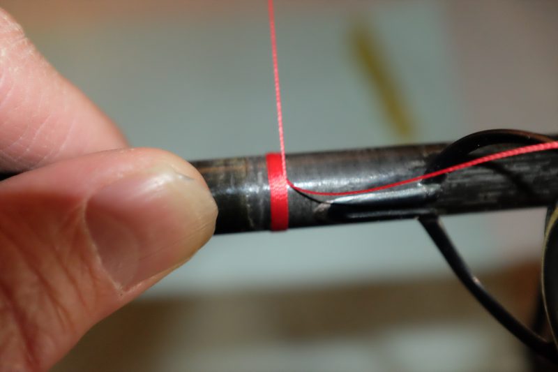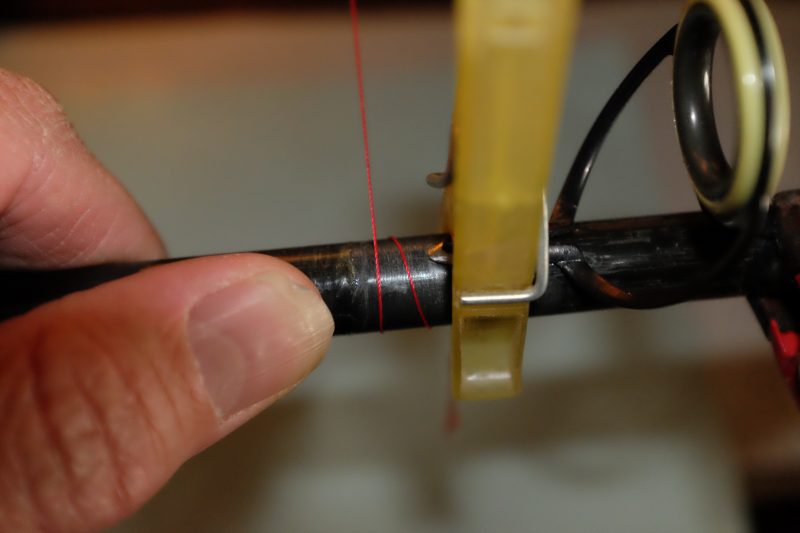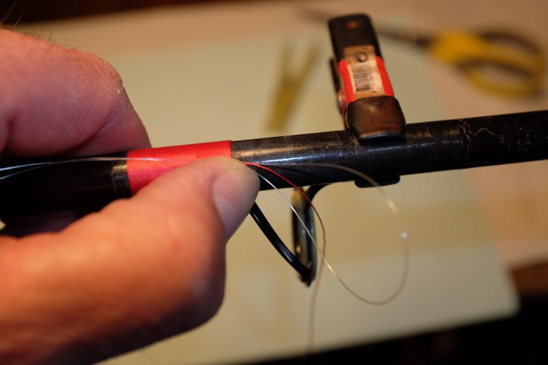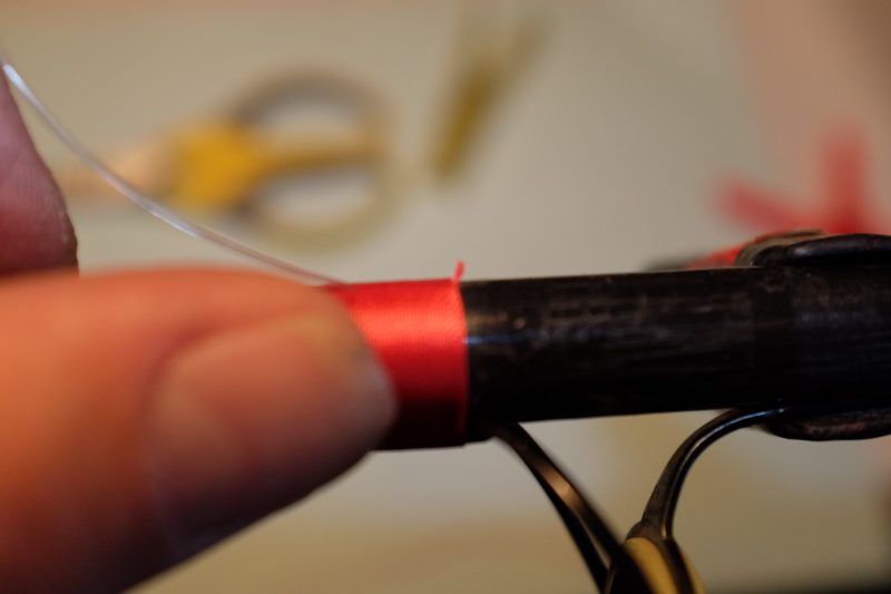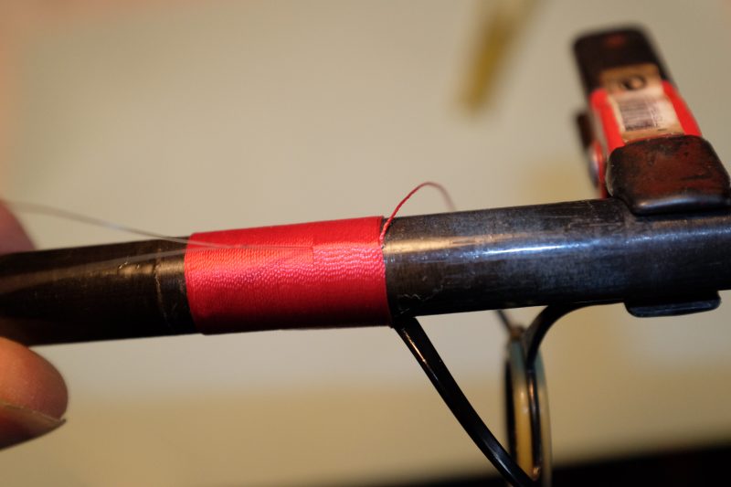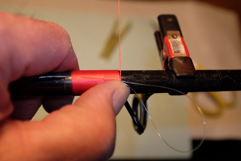 We klemmen de draad vast met de linkerduim (op de foto linkerduim wat links gezet voor duidelijkheid, maar zit normaal op draad) en draaien met rechterhand het eind een aantal keren rond de hengel richting oog. Eind vastzetten met een speld terwijl we nog steeds met linkerduim de draad vastknellen.